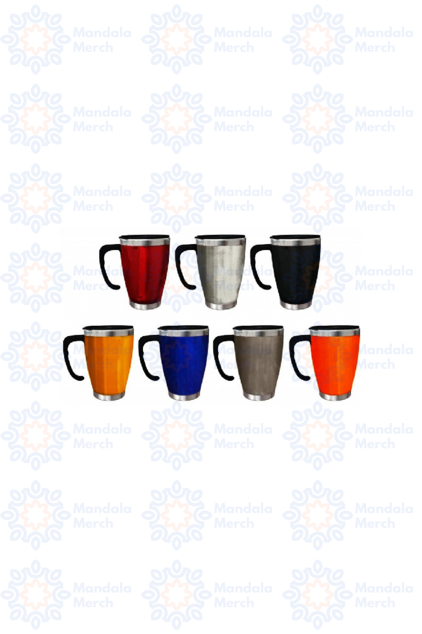Tomatodo metálico (interior y exterior) con recubrimiento de acrílico trasclúcido en el medio del cuerpo del jarro, de los diferentes colores, la tapa y asa son de plástico negro.
